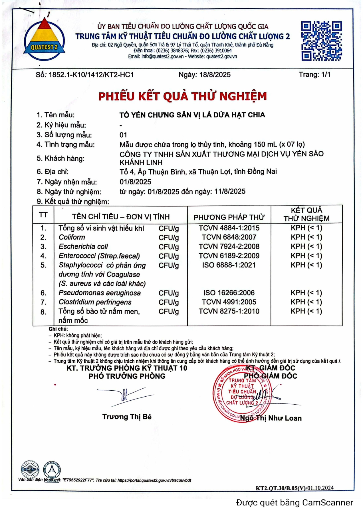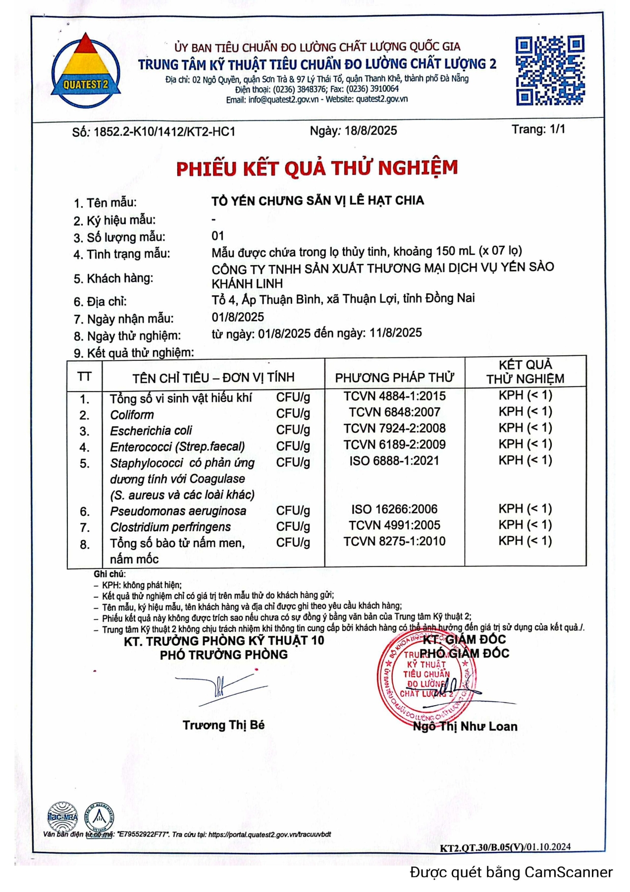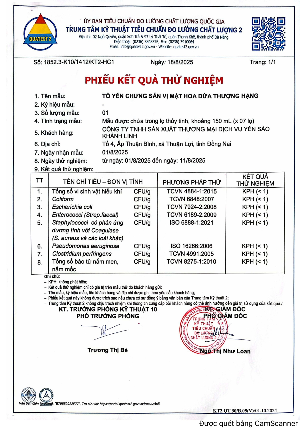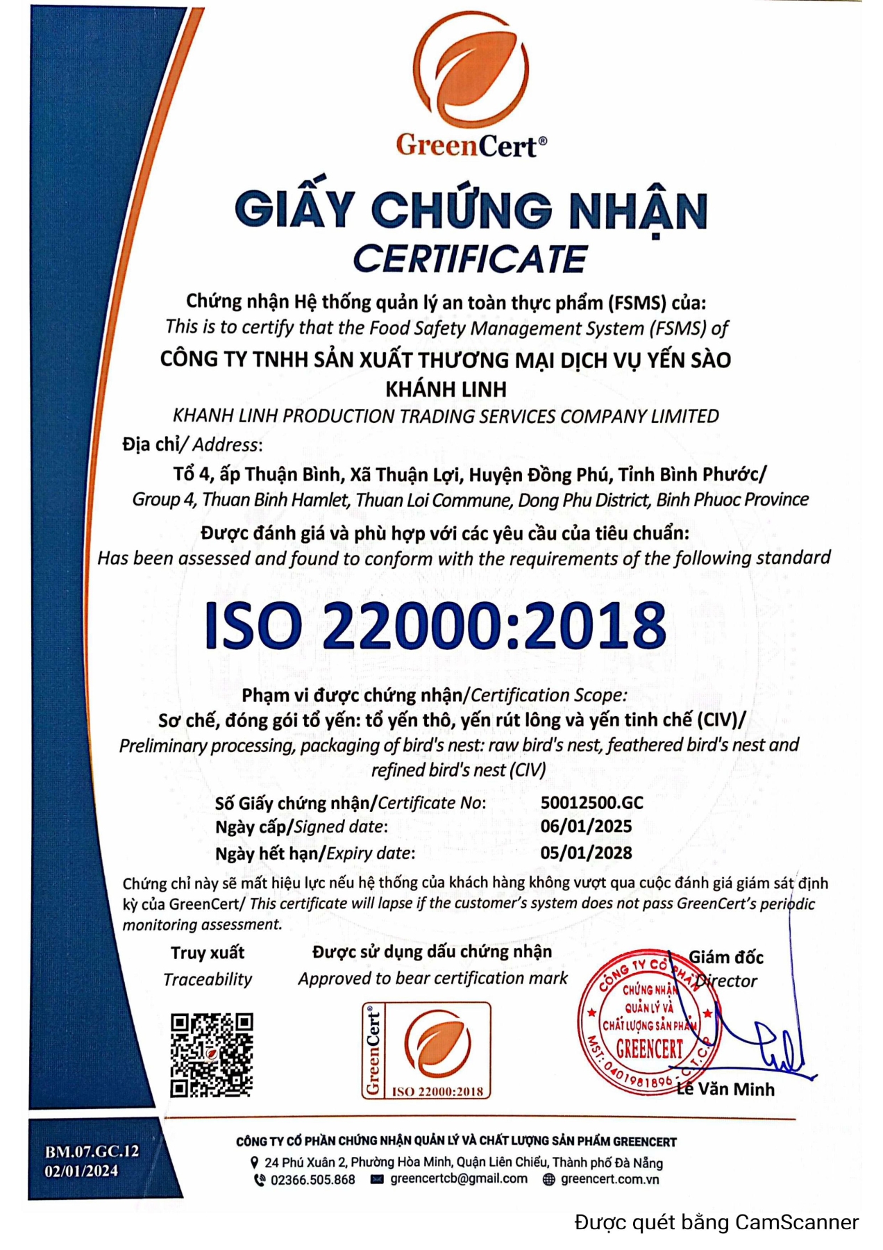 Chứng nhận Yến sào Tinh Chế Khánh Linh